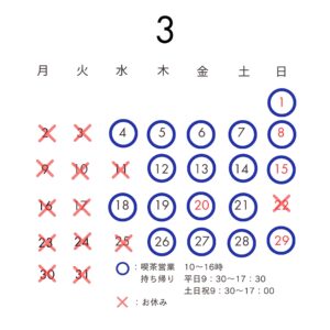Home news&media 2026.02.28 News 3月の営業について 毎週月曜日・火曜日・第二第四水曜日はお休みをいただきます。 22日日曜日は臨時休業させていただきます。 3月は外構工事の予定がございます。駐車スペースがない場合は ガトーミュール南にある公園の駐車場をご利用ください。 ご迷惑をおかけいたしますがご理解ご協力をお願いいたします。 ホワイトデーはご予約をおすすめいたします。 だんだんと春の陽気を感じられるようになりました。 3月末・4月あたまごろから桜や菜の花が見ごろになります。 ぜひドライブがてらご来店ください。